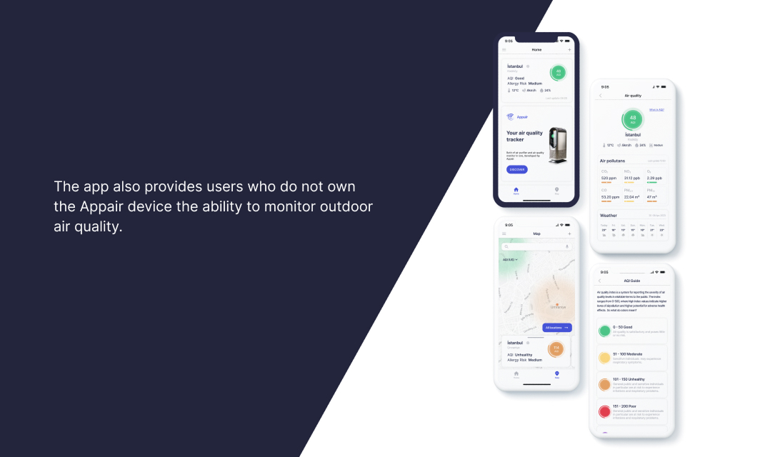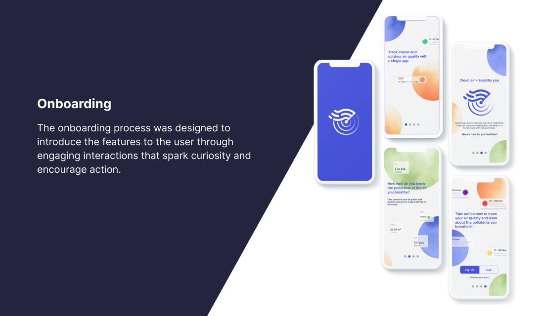 • Prioritized the following for the application: global usage, accessibility (ability to use the app without the device), user-centered design, real-time air quality display, educational content (detailed information about pollutants and global air standards), and a stylish, portable device that can both purify and monitor air.
