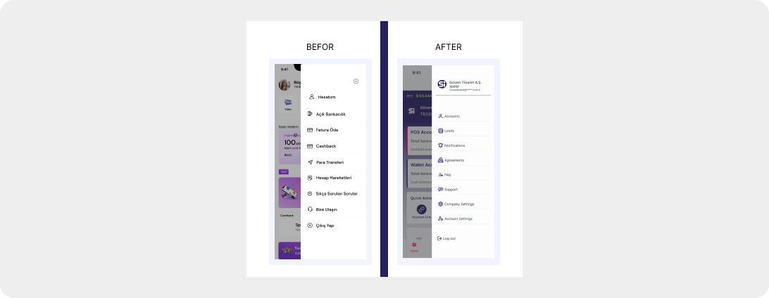 ✓ Settings, agreements, and account-related actions were relocated to the hamburger menu, keeping essential operations easily accessible while organizing secondary actions.